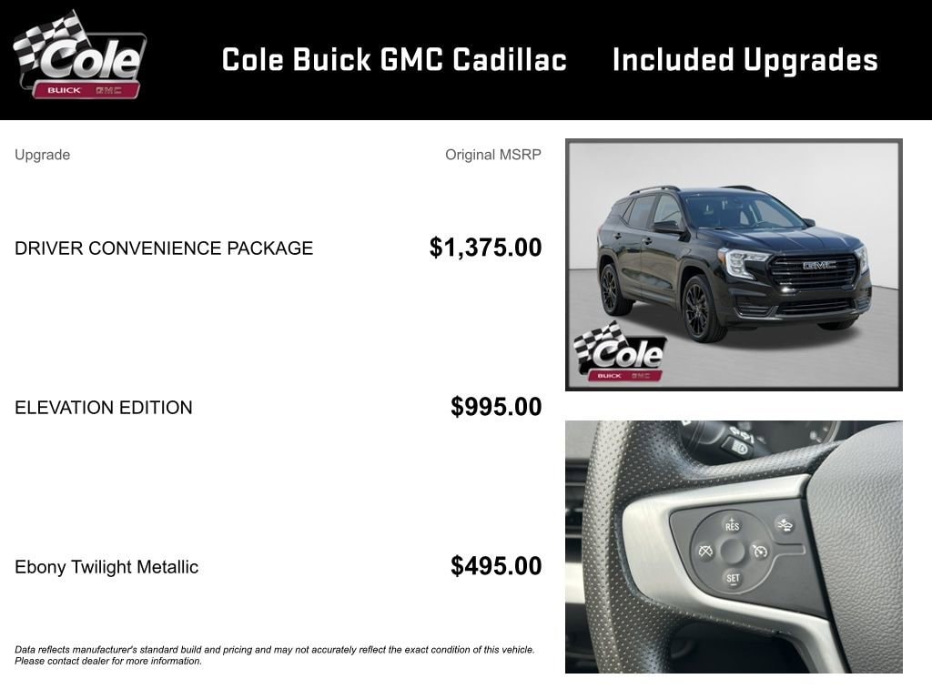 Recent Arrival! CARFAX One-Owner. Odometer is 11128 miles below market average!Ebony Twilight Metallic 2023 GMC Terrain SLE 4D Sport Utility AWD 9-Speed Automatic 1.5L DOHCCertified. GMC Certified Pre-Owned Details:* Vehicle History* Roadside Assistance* Powertrain Limited Warranty: 72 Month/100,000 Mile (whichever comes first) from original in-service date* Warranty Deductible: $0* Transferable Warranty* 24 months/24,000 miles (whichever comes first) Certified Pre-Owned Scheduled Maintenance Plan and 3 days/150 miles (whichever comes first) Vehicle Exchange Program. SiriusXM 3-month trial subscription* 172 Point Inspection* Limited Warranty: 12 Month/12,000 Mile (whichever comes first) from certified purchase dateGMC Certified Pre-Owned Certified, AWD, 2 USB Data Ports w/Auxiliary Input Jack, 3.47 Axle Ratio, 4-Way Manual Driver's Seat, 4-Way Manual Front Passenger Seat, 4-Wheel Disc Brakes, 4.2 Multi-Color Driver Information Screen, 6 Speakers, 6-Speaker Audio System Feature, 8-Way Power Driver Seat Adjuster, ABS brakes, Air Conditioning, Alloy wheels, AM/FM radio: SiriusXM, Auto High-beam Headlights, Auto-dimming Rear-View mirror, Black GMC Center Caps w/Red GMC Lettering, Black Mirror Caps, Bluetooth® For Phone, Brake assist, Bumpers: body-color, Cold Air Grille Shutter, Compass, Darkened Front Grille, Delay-off headlights, Driver & Front Passenger Heated Seats, Driver Convenience Package, Driver door bin, Driver vanity mirror, Dual front impact airbags, Dual front side impact airbags, Dual-Zone Automatic Climate Control, Electronic Stability Control, Elevation Edition, Emergency communication system: OnStar and GMC connected services capable, Four wheel independent suspension, Front & Rear Black GMC Emblems (LPO), Front anti-roll bar, Front Bucket Seats, Front Center Armrest, Front reading lights, Fully automatic headlights, Heated door mirrors, Illuminated entry, Lane Departure Warning System, Low tire pressure warning, Occupant sensing airbag, Outside temperature display, Overhead airbag, Overhead console, Panic alarm, Passenger door bin, Passenger vanity mirror, Power door mirrors, Power Driver Lumbar Control, Power steering, Power windows, Preferred Equipment Group 3SA, Premium Cloth Seat Trim, Radio data system, Radio: GMC Infotainment Audio System w/7 Display, Rear anti-roll bar, Rear seat center armrest, Rear window defroster, Rear window wiper, Remote keyless entry, Remote Start, Roof-Mounted Luggage Rack Side Rails, Security system, SiriusXM Radio, Speed control, Speed-sensing steering, Split folding rear seat, Spoiler, Steering wheel mounted audio controls, Tachometer, Telescoping steering wheel, Tilt steering wheel, Traction control, Trip computer, Variably intermittent wipers, Wheels: 17 x 7 Silver Painted Aluminum, Wheels: 19 Gloss Black Aluminum, Wireless Apple CarPlay/Wireless Android Auto, AWD.