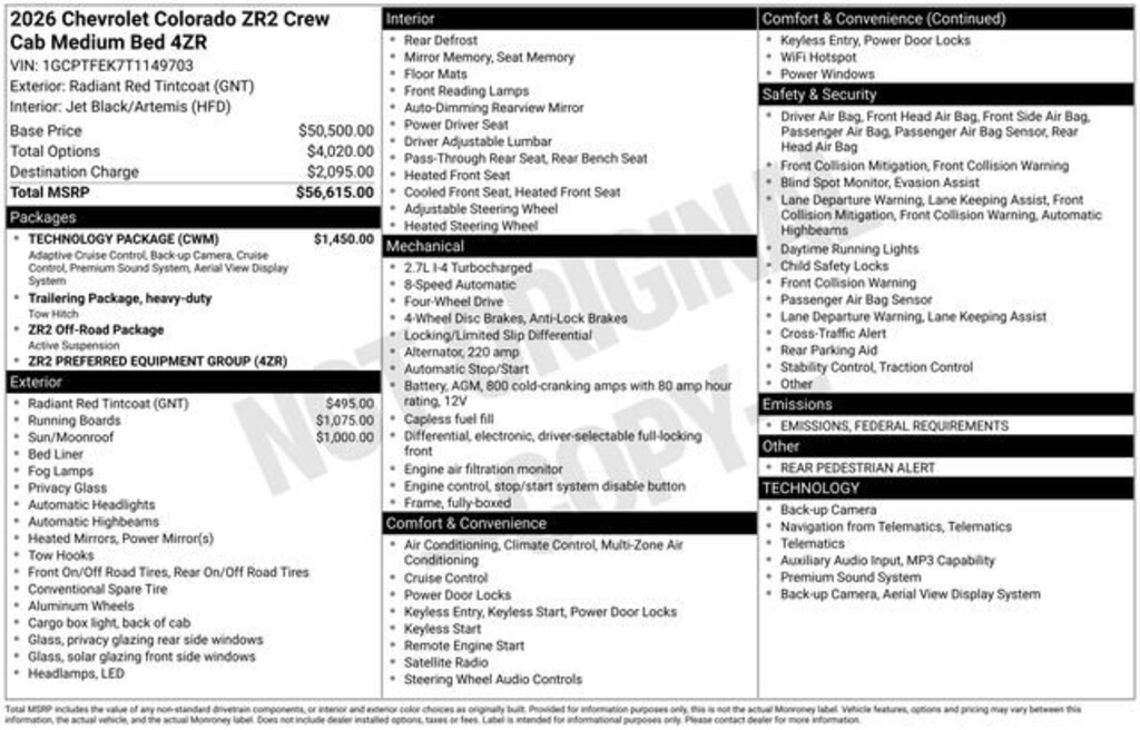 Price includes: $500 - Chevrolet Consumer Cash Program. Exp. 01/02/2026 WE DELIVER! BUY ONLINE-TEXT-EMAIL-CHAT-PHONE AND WE WILL DELIVER YOUR NEXT VEHICLE TO YOUR DOOR! FROM OUR SALES FLOOR TO YOUR DOOR! IT'S THAT EASY! All New Car Pricing Assumes GMS Employee Qualifications. Radiant Red Tintcoat 2026 Chevrolet Colorado ZR2 4WD 8-Speed Automatic 2.7L I4 Turbocharged DOHC 16V LEV3-ULEV50 310hp