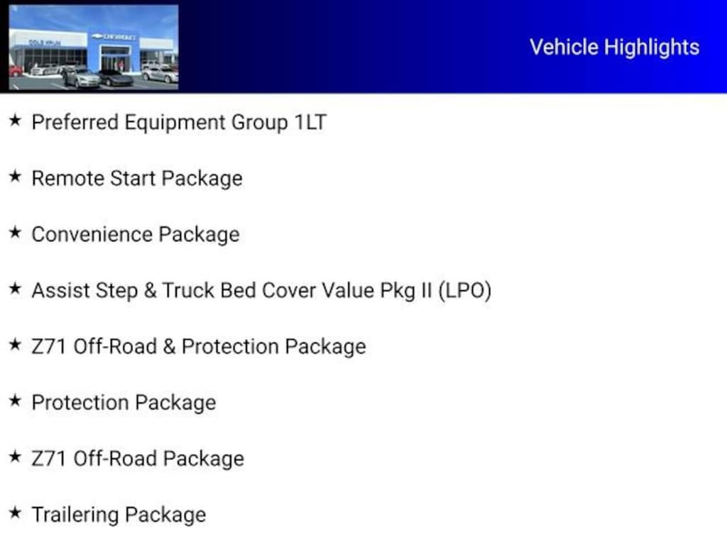 Silverado 1500 LT LT1, 4D Crew Cab, 3.0L I6, 10-Speed Automatic, 4WD, Cypress Gray, Black Cloth, 10-Way Power Driver Seat w/Lumbar, 12.3 Multicolor Reconfigurable Digital Display, 120-Volt Bed Mounted Power Outlet, 120-Volt Interior Power Outlet, 4 Chromed Round Assist Steps (LPO), All-Star Edition, All-Weather Floor Liner (LPO) (AAK), Assist Step & Truck Bed Cover Value Pkg II (LPO), Auto-Locking Rear Differential, Bluetooth® For Phone, Chevytec Spray-On Black Bedliner, Chrome Mirror Caps, Color-Keyed Carpeting Floor Covering, Convenience Package, Deep-Tinted Glass, Dual Exhaust w/Polished Outlets, Dual Rear USB Ports (Charge Only), Dual-Zone Automatic Climate Control, Electric Rear-Window Defogger, Electronic Cruise Control, EZ Lift Power Lock & Release Tailgate, Front Frame-Mounted Black Recovery Hooks, Front Rubberized Vinyl Floor Mats, HD Rear Vision Camera, Heated Driver & Front Outboard Passenger Seats, Heated Power-Adjustable Outside Mirrors, Heated Steering Wheel, Heavy-Duty Air Filter, Hill Descent Control, Hitch Guidance, Inside Rear-View Mirror w/Tilt, Integrated Trailer Brake Controller, Keyless Open & Start, LED Cargo Area Lighting, Manual Tilt/Telescoping Steering Column, Off-Road Suspension, OnStar Services Capable, Power Front Windows w/Driver Express Up/Down, Power Front Windows w/Passenger Express Down, Power Rear Windows w/Express Down, Preferred Equipment Group 1LT, Protection Package, Rear 60/40 Folding Bench Seat (Folds Up), Rear Rubberized-Vinyl Floor Mats, Rear Wheelhouse Liners, Remote Start Package, Remote Vehicle Starter System, SiriusXM w/360L Trial Subscription, Soft Folding Truck Bed Cover (LPO), Standard Suspension Package, Standard Tailgate, Steering Wheel Audio Controls, Teen Driver, Theft Deterrent System (Unauthorized Entry), Tire Pressure Monitoring System, Trailering Package, Wheels: 18 x 8.5 Bright Silver Painted Aluminum, Wi-Fi Hot Spot Capable, Wrapped Steering Wheel, Z71 Off-Road & Protection Package, Z71 Off-Road Package, 2 USB Data Ports, 220 Amp Alternator, 3.23 Rear Axle Ratio, 4-Wheel Disc Brakes, 40/20/40 Front Split-Bench Seat, 6 Speakers, 6-Speaker Audio System, ABS brakes, Air Conditioning, Alloy wheels, AM/FM radio: SiriusXM with 360L, Apple CarPlay/Android Auto, Auto High-beam Headlights, Automatic Emergency Braking, Automatic temperature control, Brake assist, Bumpers: chrome, Cloth Seat Trim, Compass, Delay-off headlights, Driver door bin, Driver vanity mirror, Dual front impact airbags, Dual front side impact airbags, Electronic Stability Control, Electronic Transmission Range Selector Shifter, Emergency communication system: OnStar, Engine Block Heater, Floor Mounted Center Console, Following Distance Indicator, Forward Collision Alert, Front anti-roll bar, Front Bucket Seats, Front Center Armrest w/Storage, Front dual zone A/C, Front Pedestrian Braking, Front reading lights, Front wheel independent suspension, Fully automatic headlights, Heated door mirrors, Heated front seats, Heated steering wheel, Illuminated entry, IntelliBeam Automatic High Beam On/Off, Lane Keep Assist w/Lane Departure Warning, Low tire pressure warning, Occupant sensing airbag, Outside temperature display, Overhead airbag, Overhead console, Panic alarm, Passenger door bin, Passenger vanity mirror, Power door mirrors, Power driver seat, Power steering, Power windows, Premium audio system: Chevrolet Infotainment 3 Premium, Radio data system, Radio: Chevrolet Infotainment 3 Premium System, Rear reading lights, Rear step bumper, Rear window defroster,