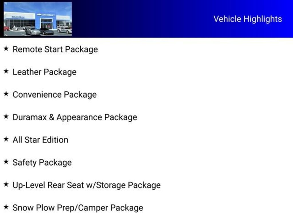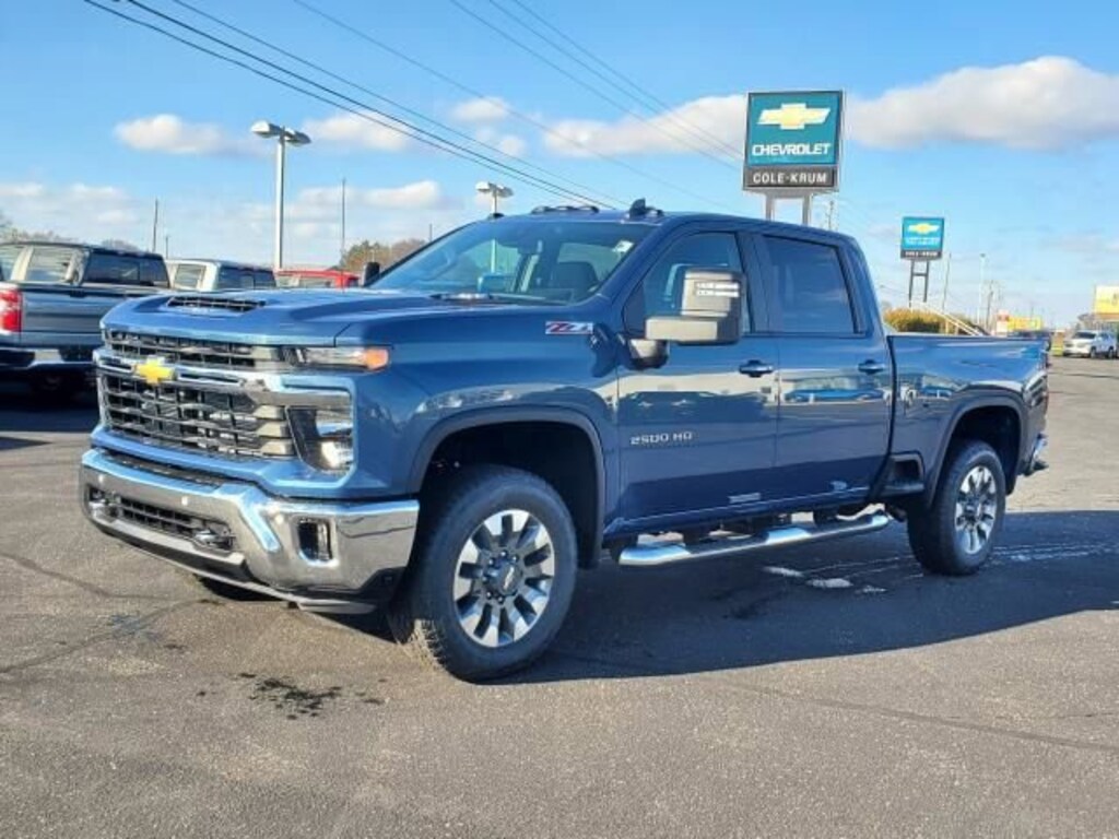 Silverado 2500HD LT, 4D Crew Cab, Duramax 6.6L V8 Turbodiesel, 10-Speed Automatic, 4WD, Lakeshore Blue Metallic, Jet Black Cloth, 10-Way Power Driver Seat Adjuster w/Lumbar, 220 Amp Alternator, 4 Round Chromed Assist Steps (LPO), All Star Edition, Bed View Camera w/2 Trailer Camera Provisions, Convenience Package, Dual-Zone Automatic Climate Control, Duramax & Appearance Package, Electric Rear-Window Defogger, Front Chrome Recovery Hooks, Front LED Fog Lamps, HD Surround Vision, Heat Package, Heated Driver & Front Outboard Passenger Seating, Heated Steering Wheel, Hill Descent Control, In-Vehicle Trailering App System, Leather Package, LED Cargo Area Lighting, Manual Tilt & Telescoping Steering Column, Off-Road Suspension, Rear Cross Traffic Alert, Remote Start Package, Remote Vehicle Starter System, Safety Package, Snow Plow Prep/Camper Package, Suspension Package, Trailer Camera Provisions, Trailer Side Blind Zone Alert, Ultrasonic Front & Rear Park Assist, Unauthorized Entry Theft-Deterrent System, Up-Level Rear Seat w/Storage Package, Wheels: 20 10-Spoke Machined Aluminum, Z71 Off-Road Package, 120-Volt Bed Mounted Power Outlet, 120-Volt Interior Power Outlet, 17 Machined Aluminum Wheels, 170 Amp Alternator, 2 Charge/Data USB Ports Inside Center Console, 2-Speed Active Electronic AutoTrac Transfer Case, 2-Speed Electronic Shift Transfer Case, 3 Years SiriusXM, 4-Way Manual Driver Seat Adjuster, 4-Wheel Disc Brakes, 5th Wheel & Gooseneck Trailer Wiring Provisions, 6 Speakers, 6-Speaker Audio System, 720 Cold-Cranking Amps Heavy-Duty Battery, ABS brakes, Adaptive Cruise Control, Air Conditioning, Alloy wheels, AM/FM radio: SiriusXM with 360L, Apple CarPlay/Android Auto, Auto High-beam Headlights, Auto-Dimming Inside Rear-View Mirror, Black Mirror Caps, Bluetooth® For Phone, Brake assist, Bumpers: chrome, Chevrolet Connected Access Capable, Cloth Rear Seat w/Storage Package, Cloth Seat Trim, Color-Keyed Carpeting Floor Covering, Compass, Convenience Package II, Deep-Tinted Glass, Delay-off headlights, Driver door bin, Driver vanity mirror, Dual front impact airbags, Dual front side impact airbags, Durabed Pickup Bed, Electronic Cruise Control w/Set & Resume Speed, Electronic Stability Control, Emergency communication system: OnStar, EZ Lift Power Lock & Release Tailgate, Floor-Mounted Center Console, Front 40/20/40 Split-Bench Seats w/Lockable Storage, Front anti-roll bar, Front Bucket Seats, Front Center Armrest w/Storage, Front reading lights, Front Rubberized Vinyl Floor Mats, Front wheel independent suspension, Fully automatic headlights, Halogen Reflector Headlamps, HD Rear Vision Camera, Heated & Auto-Dimming Vertical Trailering Mirrors, Heated door mirrors, Heated Vertical Trailering Mirrors, Hitch Guidance w/Hitch View, Illuminated entry, Keyless Open & Start, LED Smoked Amber Roof Marker Lamps, Low tire pressure warning, Occupant sensing airbag, OnStar Services Capable, Outside temperature display, Overhead airbag, Overhead console, Panic alarm, Passenger door bin, Passenger vanity mirror, Power Door Locks, Power door mirrors, Power Front Windows w/Driver Express Up/Down, Power Front Windows w/Passenger Express Down, Power Rear Windows w/Express Down, Power Sliding Rear Window w/Defogger, Power steering, Power windows, Premium audio system: Chevrolet Infotainment 3 Premium, Push Button Start, Pwr Up/Down Tailgate Function w/Pwr Lock & Release, Radio: Chevrolet Infotainment 3 Premium System, Rear 60/40 Folding Bench Seat (Folds Up), Rear reading lights, Rear Rubberized Vinyl Floo
