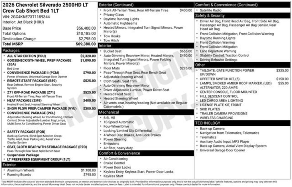 10-Speed Automatic, 4WD, Jet Black Cloth, 10-Way Power Driver Seat Adjuster with Lumbar, 120-Volt Bed Mounted Power Outlet, 120-Volt Interior Power Outlet, 17 Machined Aluminum Wheels, 170 Amp Alternator, 1st and 2nd Row All-Weather Floor Liners, 2 Charge/Data USB Ports Inside Center Console, 2-Speed Electronic Shift Transfer Case, 220 Amp Alternator, 3.73 Rear Axle Ratio, 4-Way Manual Driver Seat Adjuster, 4-Wheel Disc Brakes, 6 Speakers, 6-Speaker Audio System, 6 Rectangular Chromed Tubular Assist Steps, 720 Cold-Cranking Amps Heavy-Duty Battery, ABS brakes, Air Conditioning, All Star Edition, Alloy wheels, AM/FM radio: SiriusXM with 360L, Apple CarPlay/Android Auto, Auto High-beam Headlights, Auto-Dimming Inside Rear-View Mirror, Bed View Camera with Two Trailer Camera Provisions, Black Chevytec Spray-on Bedliner, Black Mirror Caps, Bluetooth® For Phone, Brake assist, Bumpers: chrome, Chevrolet Connected Access Capable, Cloth Rear Seat with Storage Package, Cloth Seat Trim, Color-Keyed Carpeting Floor Covering, Compass, Convenience Package, Convenience Package II, Deep-Tinted Glass, Delay-off headlights, Driver door bin, Driver vanity mirror, Dual front impact airbags, Dual front side impact airbags, Dual-Zone Automatic Climate Control, Durabed Pickup Bed, Electric Rear-Window Defogger, Electronic Cruise Control with Set and Resume Speed, Electronic Stability Control, Emergency communication system: OnStar, EZ Lift Power Lock and Release Tailgate, Floor-Mounted Center Console, Front 40/20/40 Split-Bench Seats with Lockable Storage, Front anti-roll bar, Front Bucket Seats, Front Center Armrest w/Storage, Front LED Fog Lamps, Front License Plate Kit, Front reading lights, Front Rubberized Vinyl Floor Mats, Front wheel independent suspension, Fully automatic headlights, Gooseneck/5th Wheel Prep Package, Halogen Reflector Headlamps, HD Rear Vision Camera, HD Surround Vision, Heat Package, Heated and Auto-Dimming Vertical Trailering Mirrors, Heated door mirrors, Heated Driver and Front Outboard Passenger Seating, Heated Steering Wheel, Heated Vertical Trailering Mirrors, Hill Descent Control, Hitch Guidance with Hitch View, Illuminated entry, in-Vehicle Trailering App System, Keyless Open and Start, LED Cargo Area Lighting, LED Smoked Amber Roof Marker Lamps, Low tire pressure warning, Manual Tilt and Telescoping Steering Column, Occupant sensing airbag, OnStar Services Capable, Outside temperature display, Overhead airbag, Overhead console, Panic alarm, Passenger door bin, Passenger vanity mirror, Power Door Locks, Power door mirrors, Power Front Windows with Driver Express Up/Down, Power Front Windows with Passenger Express Down, Power Rear Windows with Express Down, Power Sliding Rear Window with Defogger, Power steering, Power Up/Down Tailgate Function with Power Lock and Release, Power windows, Preferred Equipment Group 1LT, Premium audio system: Chevrolet Infotainment 3 Premium, Push Button Start, Radio: Chevrolet Infotainment 3 Premium System, Rear 60/40 Folding Bench Seat (folds Up), Rear Cross Traffic Alert, Rear reading lights, Rear Rubberized Vinyl Floor Mats, Rear step bumper, Remote keyless entry, Remote Start Package, Remote Vehicle Starter System, Safety Package, SiriusXM with 360L Trial Subscription, Snow Plow Prep/Camper Package, Speed control, Split folding rear seat, Standard Tailgate, Steering Wheel Audio Controls, Steering wheel mounted audio controls, Suspension Package, Tachometer, Tilt steering wheel, Traction control, Trailer Camera Provisions, Trailer Side Blind Zone Alert, Trip computer, Turn signal in