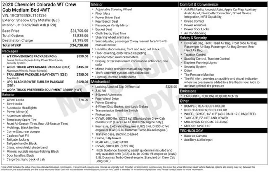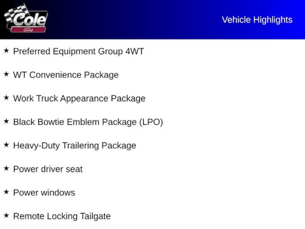 4WD, Black Bowtie Emblem Package (LPO), Body-Color Door Handles, Chrome Beltline Moldings, Electronic Automatic Cruise Control, Extended Range Remote Keyless Entry, EZ-Lift & Lower Tailgate, Heavy-Duty Trailering Package, Outside Power-Adjustable Body-Color Mirrors, Power driver seat, Power windows, Preferred Equipment Group 4WT, Rear Body-Color Bumper, Remote Locking Tailgate, Spotter Mirror, Unauthorized Entry Theft-Deterrent System, Wheels: 16" x 7" Ultra Silver Metallic Cast Alloy, Work Truck Appearance Package, WT Convenience Package, 3.42 Rear Axle Ratio, 4-Wheel Disc Brakes, 6 Speakers, 6-Speaker Audio System Feature, ABS brakes, Air Conditioning, AM/FM radio, Apple CarPlay/Android Auto, Automatic Locking Rear Differential, Bumpers: body-color, Cloth Seat Trim, Delay-off headlights, Driver 4-Way Power Seat Adjuster, Driver door bin, Dual front impact airbags, Dual front side impact airbags, Electronic Stability Control, Exterior Parking Camera Rear, Front anti-roll bar, Front Bucket Seats, Front Center Armrest, Front wheel independent suspension, Fully automatic headlights, Low tire pressure warning, Occupant sensing airbag, Overhead airbag, Passenger door bin, Passenger vanity mirror, Power steering, Premium audio system: Chevrolet Infotainment 3, Radio data system, Radio: Chevrolet Infotainment 3 System, Rear seat center armrest, Rear step bumper, Speed-sensing steering, Tachometer, Tilt steering wheel, Tow/Haul Mode, Traction control, Trip computer, Variably intermittent wipers, Wheel Locks, Wheels: 16" x 7" Ultra Silver Metallic Steel, 4WD, Black Bowtie Emblem Package (LPO), Body-Color Door Handles, Chrome Beltline Moldings, Electronic Automatic Cruise Control, Extended Range Remote Keyless Entry, EZ-Lift & Lower Tailgate, Heavy-Duty Trailering Package, Outside Power-Adjustable Body-Color Mirrors, Power driver seat, Power windows, Preferred Equipment Group 4WT, Rear Body-Color Bumper, Remote Locking Tailgate, Spotter Mirror, Unauthorized Entry Theft-Deterrent System, Wheels: 16" x 7" Ultra Silver Metallic Cast Alloy, Work Truck Appearance Package, WT Convenience Package.