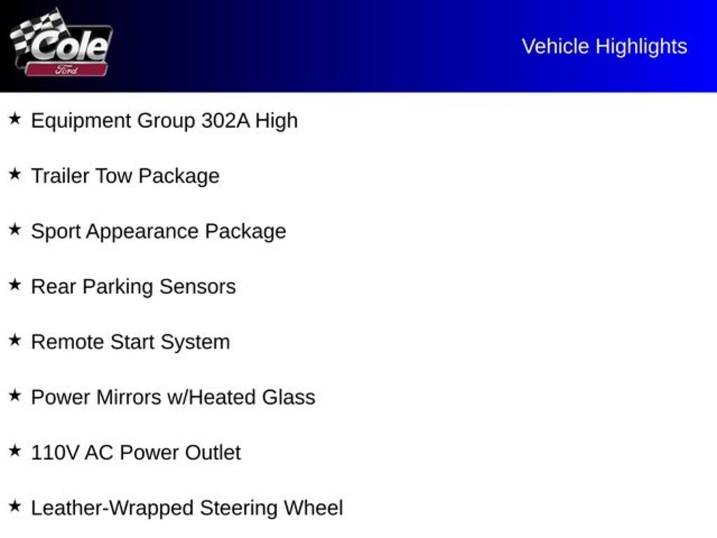 4WD, 110V AC Power Outlet, Auto-Dimming Rear-View Mirror, Class IV Trailer Hitch Receiver, Equipment Group 302A High, Heated Front Seats, Leather-Wrapped Shifter, Leather-Wrapped Steering Wheel, Manual-Sliding Rear Window, Power Mirrors w/Heated Glass, Rear Parking Sensors, Remote Start System, Sport Appearance Package, Trailer Tow Package, 4-Wheel Disc Brakes, 4G LTE Wi-Fi Hotspot Removal, 5" Rectangular Black Running Boards, 6 Speakers, ABS brakes, Air Conditioning, Alloy wheels, AM/FM radio: SiriusXM, AM/FM Stereo, Auto High-beam Headlights, Auto Start-Stop Removal, Automatic temperature control, Black Mesh Grille w/Magnetic Painted Surround, Black Wheel-Lip Molding, Brake assist, Bumpers: body-color, Compass, Delay-off headlights, Driver door bin, Driver vanity mirror, Dual front impact airbags, Dual front side impact airbags, Electronic Stability Control, Emergency communication system: SYNC 3 911 Assist, Exterior Parking Camera Rear, Front & Rear Splash Guards/Mud Flaps, Front anti-roll bar, Front Bucket Seats, Front Center Armrest, Front dual zone A/C, Front fog lights, Front Premium Cloth Bucket Seats, Front reading lights, Front wheel independent suspension, Fully automatic headlights, Illuminated entry, Low tire pressure warning, Magnetic Painted Fender Vent Surround, Magnetic Painted Front & Rear Bumper, Occupant sensing airbag, Outside temperature display, Overhead airbag, Overhead console, Panic alarm, Passenger door bin, Passenger vanity mirror, Power door mirrors, Power steering, Power windows, Rear reading lights, Rear seat center armrest, Rear step bumper, Rear window defroster, Remote keyless entry, Security system, SiriusXM Satellite Radio, Speed control, Speed-sensing steering, Sport Box Decal, Steering wheel mounted audio controls, SYNC 3, SYNC 3/Apple CarPlay/Android Auto, Telescoping steering wheel, Tilt steering wheel, Tough Bed Spray-In Bedliner, Traction control, Tray Style Floor Liner, Trip computer, Variably intermittent wipers, Voltmeter, Wheels: 17" Magnetic Painted Aluminum Sport, Wheels: 17" Silver-Painted Aluminum, 4WD, 110V AC Power Outlet, Auto-Dimming Rear-View Mirror, Class IV Trailer Hitch Receiver, Equipment Group 302A High, Heated Front Seats, Leather-Wrapped Shifter, Leather-Wrapped Steering Wheel, Manual-Sliding Rear Window, Power Mirrors w/Heated Glass, Rear Parking Sensors, Remote Start System, Sport Appearance Package, Trailer Tow Package.